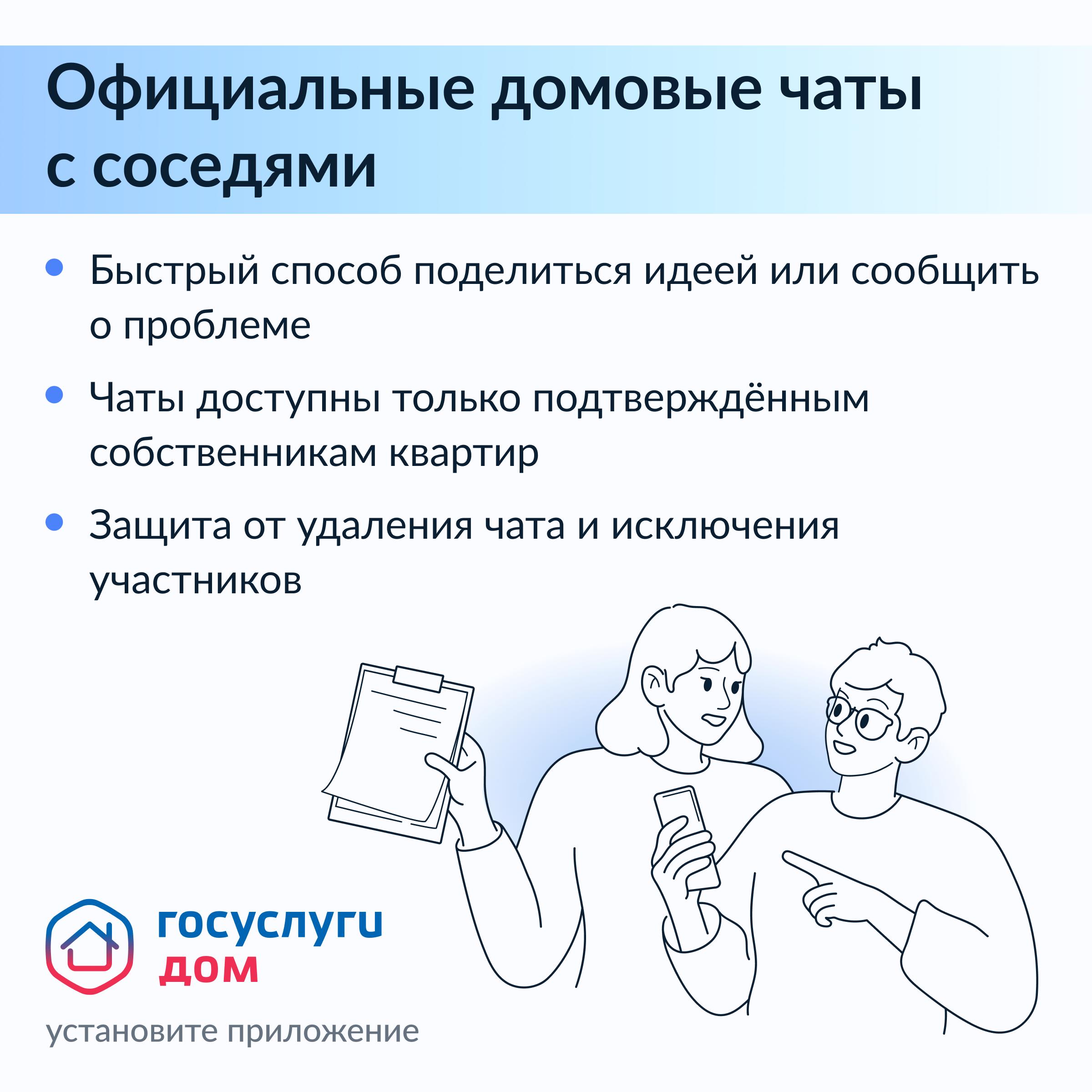 - общение с соседями в официальном чате дома, где общаются только собственники квартир;